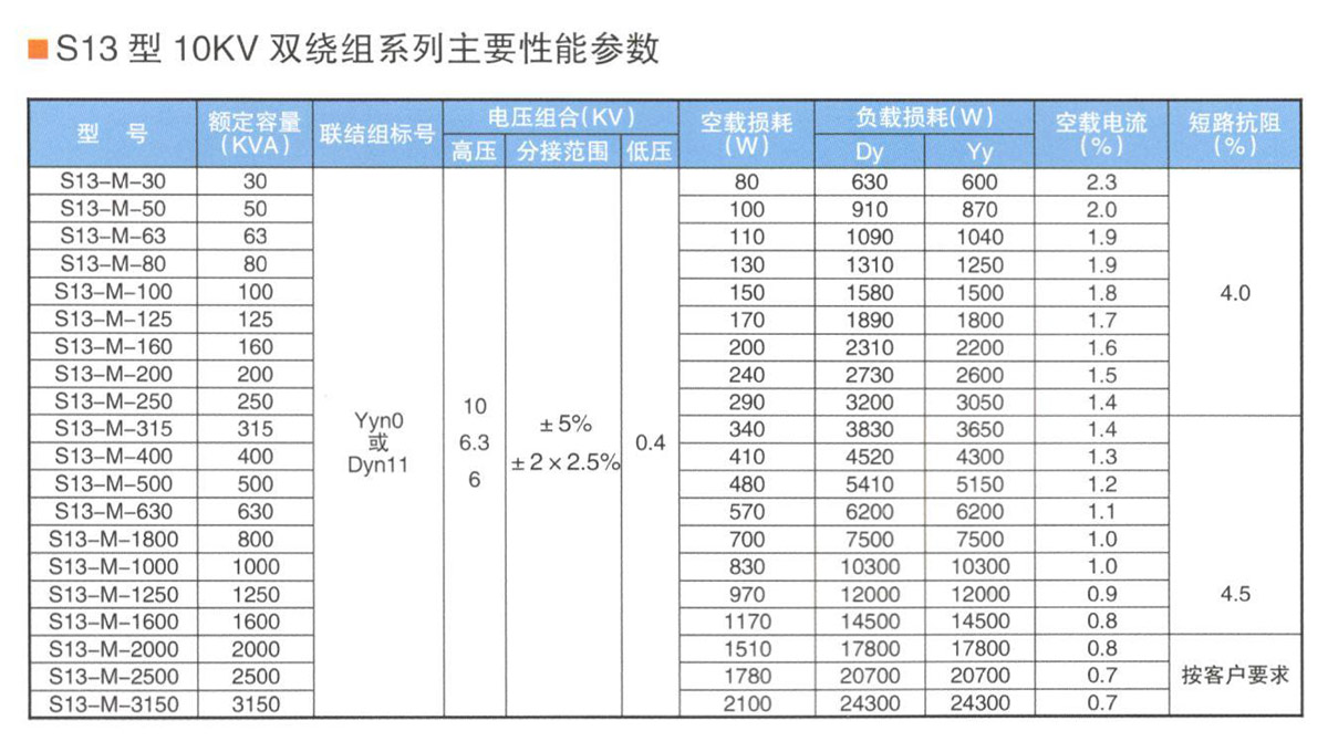 產品概括 S13型是我公司在原S11配電變壓器基礎_上,通過新材料、新工藝的研究運用及自主創新與技術引進結合的方式,通過對鐵心及線圈結構的優化創新設計,達到降低空載損耗及噪音的目的自主開發的產品。 空載損耗平均下降了37%。噪聲水平與現行國標JB/T10088- 2004比較平均下降20%,產品性能水平達到國內先進水平。